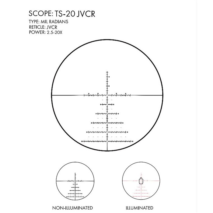 Disponible con cuatro opciones diferentes de retícula, el US Optics TS-20X cuenta con una retícula iluminada que proporciona un punto central claramente marcado para facilitar el apuntamiento en cualquier condición de iluminación. No importa qué modelo elijas, todas las retículas TS-20X están ubicadas en el primer plano focal, por lo que sabes que las subtensiones en la retícula son precisas en cualquier nivel de magnificación.