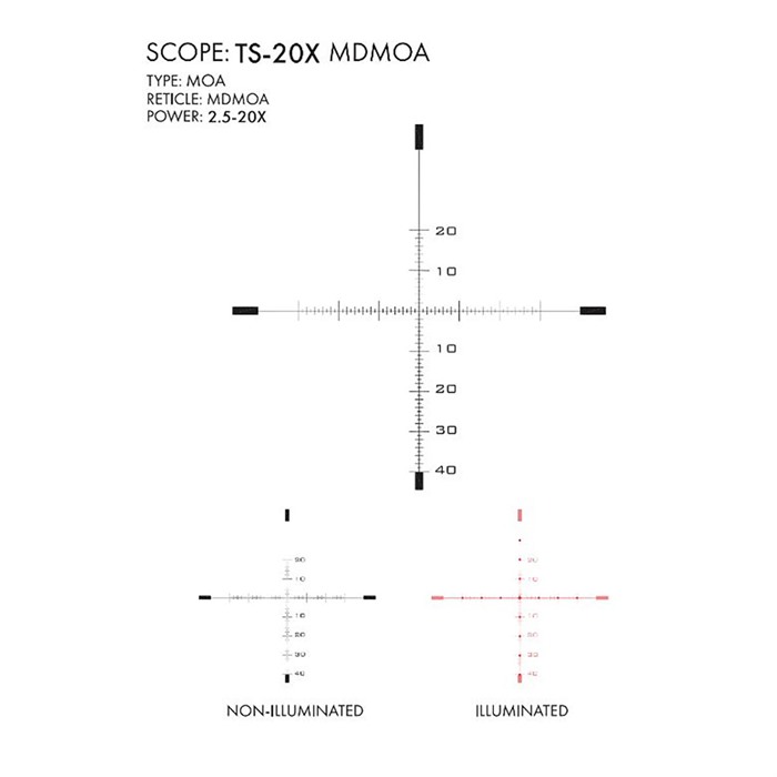 Disponible con cuatro opciones diferentes de retícula, el US Optics TS-20X cuenta con una retícula iluminada que proporciona un punto central claramente marcado para facilitar el apuntamiento en cualquier condición de luz. No importa qué modelo elijas, todas las retículas TS-20X están ubicadas en el primer plano focal, por lo que sabes que las subtensiones en la retícula son precisas en cualquier potencia de aumento.