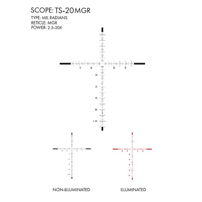 As rifles and ammunition become more capable of accurately and consistently dropping game at extended distances, long-range hunters have a need for an optic that provides the clarity and magnification they need to get on target. Too, long-range competition shooters are in need of an optimized riflescope that ensures their ability to ring steel at the outer limits of their rifle's range. The US Optics TS-20X is the perfect option for the range or field rig. The US. Optic TS-20X's construction on a large 34mm tube ensures that it'll be tough enough to withstand rugged use in the field, as well as leave room for the increased adjustment needed to land rounds at long range. Available in a 2.5-20X magnification range, this optic provides the power necessary to dial-in that extreme shot while allowing shooters to back off for a better view downrange. Length: 14.64 inches Tube size: 34mm Weight: 28.7 ounces Adjustment value: 1/4 MOA; 1/10 MIL Available with four different reticle options, the US Optic TS-20X features an illuminated reticle that provides a clearly marked center dot for easy aiming in any lighting conditions. No matter what model you choose, all TS-20X reticles are located in the first focal plane, so you know your in-reticle subtensions are accurate at any magnification power.