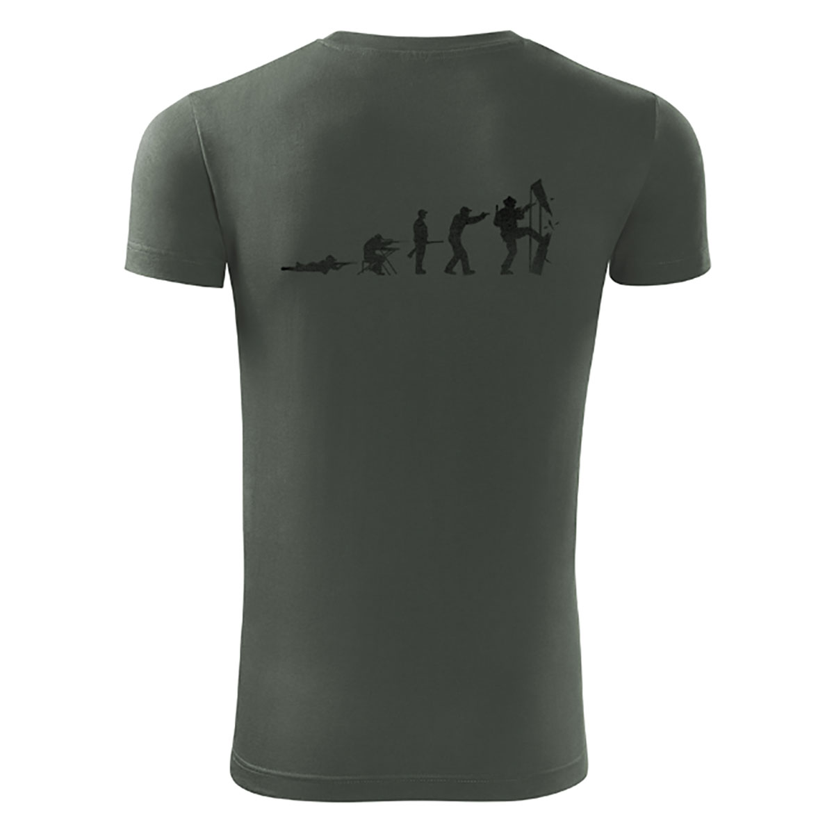 Es una camiseta de color pizarra oscuro con el logo de German Tactical Systems en el pecho y el diseño de GTS Evolution impreso en la espalda.