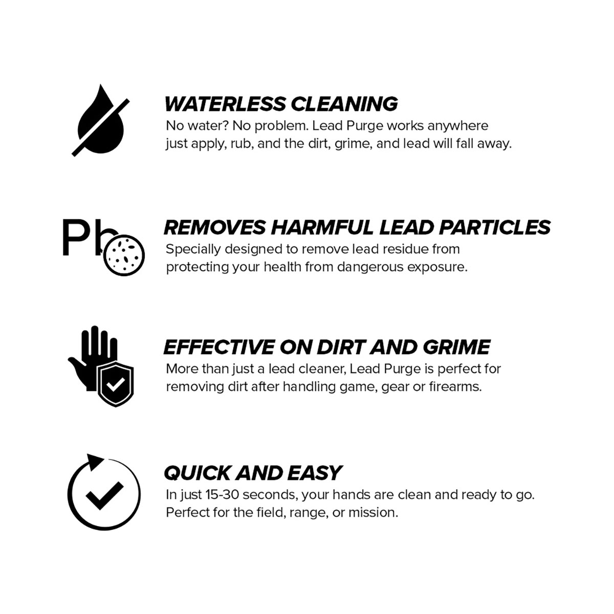 Esta solución rápida y efectiva no solo es segura para tu piel, sino que también es ideal para usar en entornos donde el agua es escasa o no está disponible. Ya sea que estés en el campo, en el campo de tiro o en el trabajo, Lead Purge asegura que mantengas la higiene y te protejas de la exposición dañina, incluso en condiciones desafiantes.