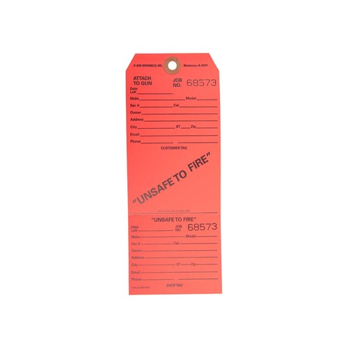 050806022010 Etiquetas de papel rojo brillante con letras negras que indican claramente que un arma no es segura para disparar. Perfectas para armas que simplemente no se pueden reparar, cuando las piezas no están disponibles, o cuando un cliente te dice que es el arma de abuelo y quiere colgarla sobre la chimenea. Un ojete reforzado asegura la etiqueta al arma de fuego. Las etiquetas están perforadas para facilitar el desgarro, de modo que tanto el propietario de la tienda como el cliente tengan un registro del estado. Se proporcionan líneas para la información del cliente y del arma de fuego.Pedido pendiente, tiempo de entrega aproximado 4-12 semanas desde el almacén de EE. UU.