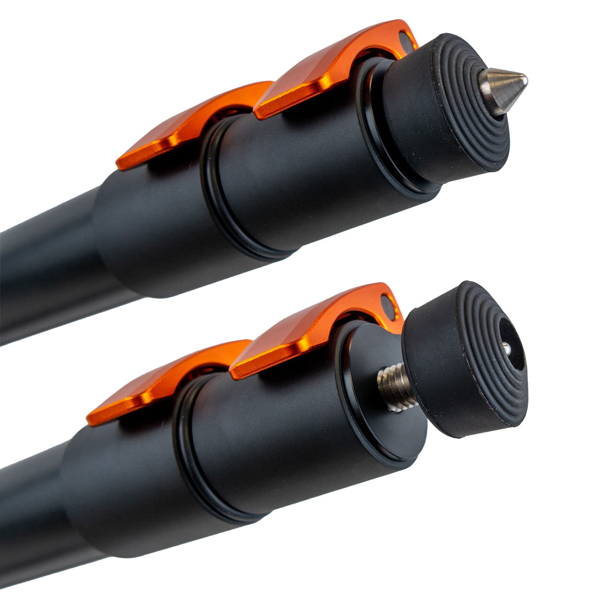 Con los quick cam locks, puedes ajustar la altura de las patas en segundos y contar con ellos para mantener la estabilidad durante el tiro. Las patas también cuentan con pies de doble función: simplemente gira para alternar entre almohadillas de goma para superficies interiores o duras y picos de acero para un mejor agarre en terrenos difíciles. No es necesario cambiar piezas; solo gira las patas para activar los picos.