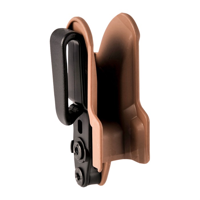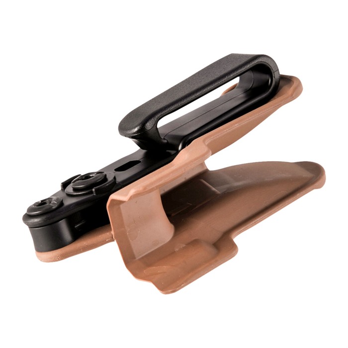 - Desmontaje fácil: El holster se puede quitar atrapando la parte frontal del holster y despegándolo. Esto permite el despliegue con una mano del arma incluso si el tether o el punto de sujeción falla.