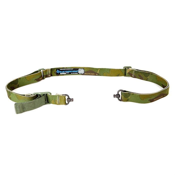 La correa cuenta con un swivel de botón de presión de 1” en la parte frontal y otro de 1.25" en la parte trasera, creando una correa ligera y simplificada que se monta en cualquier arma con sockets de liberación rápida. Los swivels no son removibles, evitando que se pierdan o que la correa se configure incorrectamente.