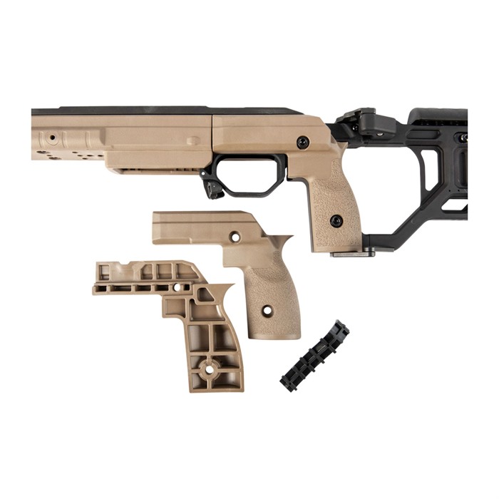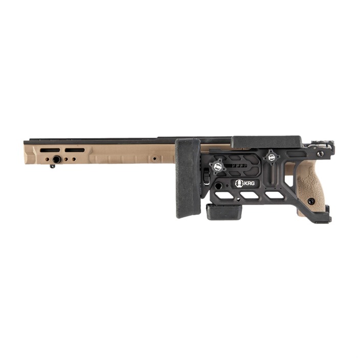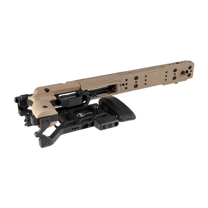Los paneles de agarre modulares de KRG permiten que el tirador adapte el ajuste del chasis a su mano, lo que, combinado con los otros ajustes, proporciona una configuración del chasis exactamente como necesita cada tirador en particular.