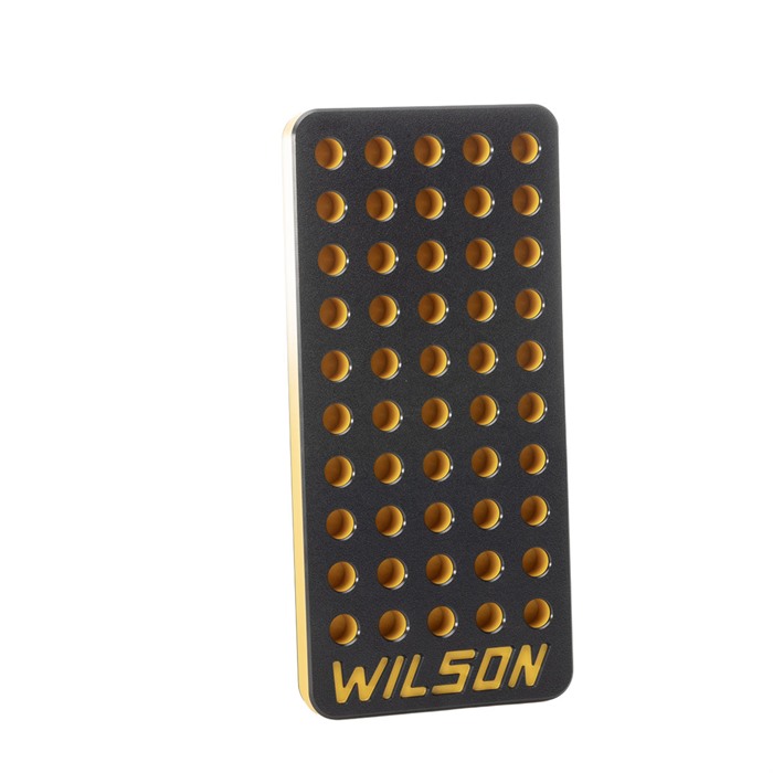 L.E. WILSON, INC. 50-ROUND RELOADING TRAYS The L.E. Wilson 50-Round Reloading Tray is designed for reloaders who need maximum capacity and efficiency on the bench. Precision-machined from durable HDPE plastic, this tray offers chemical resistance and long-lasting performance. Its low-profile design and well-spaced holes provide secure case support and easy handling, while the integrated bullet/primer cup keeps components organized during case prep. Available in multiple head sizes to fit popular cartridge families, the black/yellow finish ensures high visibility and a professional look for any reloading setup. FEATURES 50-Round Capacity – Holds up to 50 cases for high-volume reloading sessions. Integrated Bullet/Primer Cup – Convenient storage for bullets or primers during case prep. Precision-Machined HDPE Plastic – Durable, solvent-resistant material that won’t corrode. Low-Profile Design – Provides stability and easy access to cases without tipping. Black/Yellow Color Scheme – High-visibility finish for quick identification on the bench. Caliber-Specific Hole Sizes – Available in .378, .440, .473, .506, and .533 head diameters to fit common cartridge families. Made in the USA – Quality craftsmanship for long-lasting performance. Lightweight and Portable – Easy to move between bench and range. SPECS Contents: 1 loading tray in a bubble wrapped bag. Length: 10 1/4" Width: 4.801" ID: .513" Material: Polymer