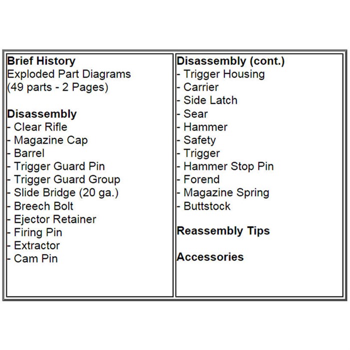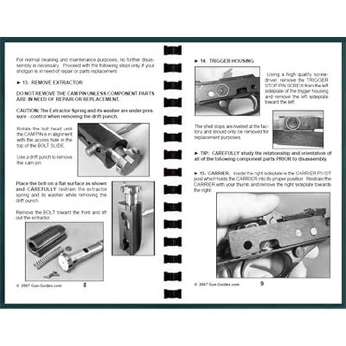 For owners of Winchester's 1300 and 1200 shotgun designs, having all the information on the gun's inner workings, as well as proper disassembly procedures, is critical to keeping your guns in working order. The Winchester 1300 & 1200 Shotguns Assembly and Disassembly Guide offers all the information needed for this critical task. Complete with detailed, part-by-part schematics and extensive, easily understood assembly instructions, the Winchester 1300 & 1200 Shotguns Assembly and Disassembly Guide covers all the bases when it comes to working knowledge of these guns. Plus, the multi-step instructions are supported by detailed photographs to help users better understand the guns. Printed on high-quality, bright, white paper Features durable cardstock cover Comb-binding lies flat on work surfaces Grayscale images Each Winchester 1300 & 1200 Shotguns Assembly and Disassembly Guide comes with unique insider tricks that avoid frustration and aid in operation, and the guide also provides users with historical information on their shotgun.