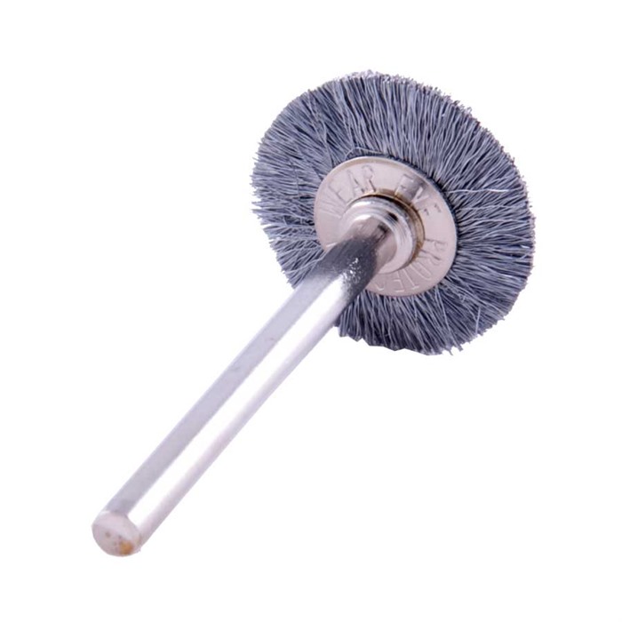 - Inserta el vástago de 1/8" (3.2 mm) del cepillo de alambre en el mandril de la herramienta rotativa.