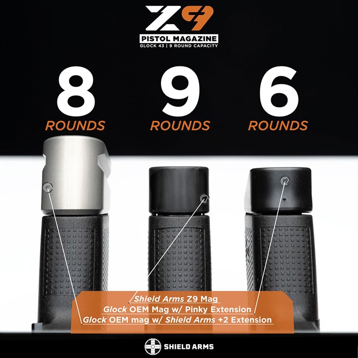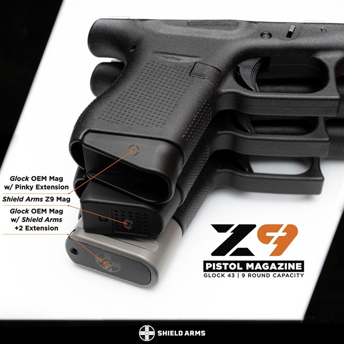 Increases the capacity of your Glock® 43 with this Z9 magazine kit from Shield Arms. The Z9 magazine kit includes one, two, or three Z9 magazines and one steel magazine catch for use in the Glock® 43. The Z9 magazine is a 9 round steel magazine that is the same length as an OEM 6 round magazine with a pinky extension, but with 50% MORE capacity. With the Z9 magazine, your Glock 43 becomes a 9+1 carry gun in a much smaller and more concealable package than a Glock 43X (thinner, shorter in height, lighter) but with 50% more capacity than an OEM Glock 43. The Z9 magazine has a black Powercron finish which is a tough epoxy coating that offers excellent corrosion resistance and low VOC in a lead-free film electrocoat surface finish. Specifications 9 round capacity Same length as an OEM Glock® 43 magazine with pinky extension Easy to remove, impact resistant base pad Powercron finish Made in the USA